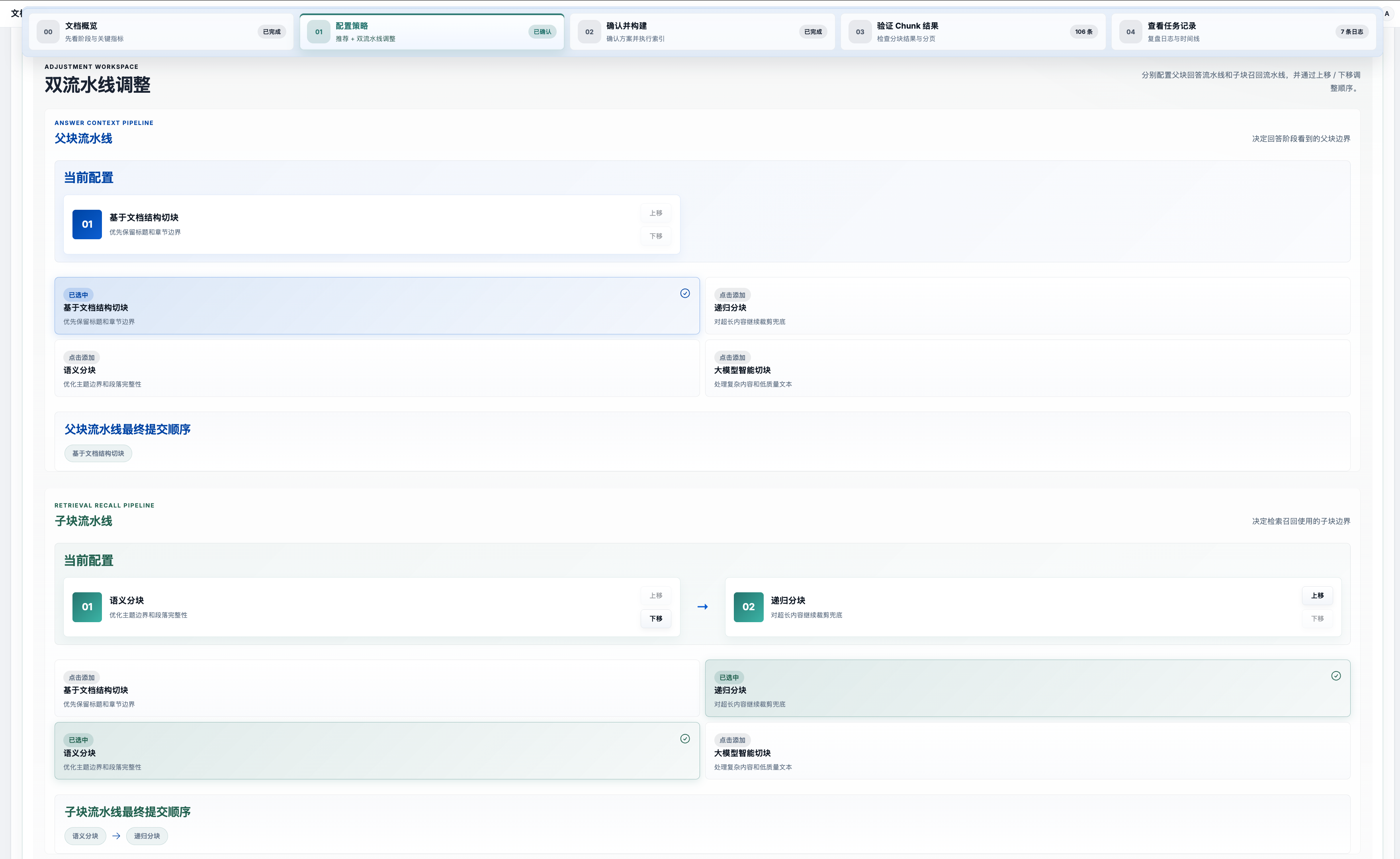 解析完成后,系统不是让用户盲选切块算法,而是根据文档类型和内容特征自动推荐最优的切块策略组合。用户可以查看推荐结果,也可以手动调整——比如文档质量不太好,可以额外开启 LLM 智能切块。