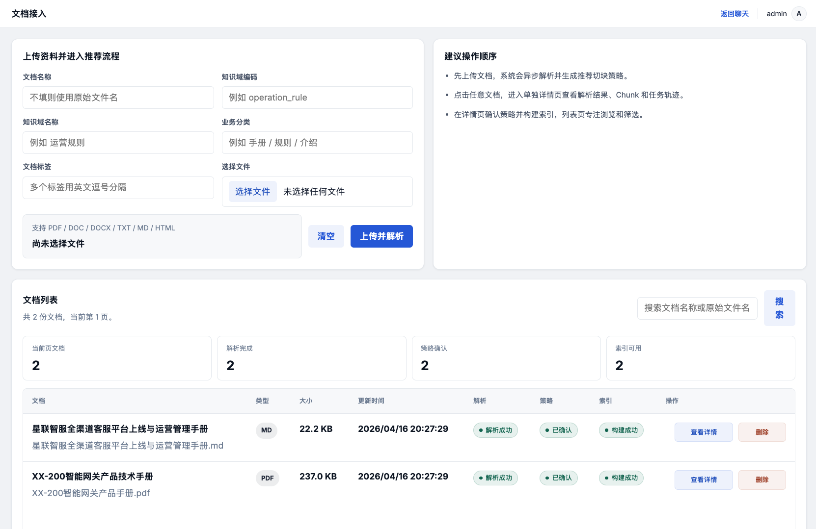 | 文档入库 | 同步处理,无日志 | Kafka 异步流水线 + 分步骤任务日志 |