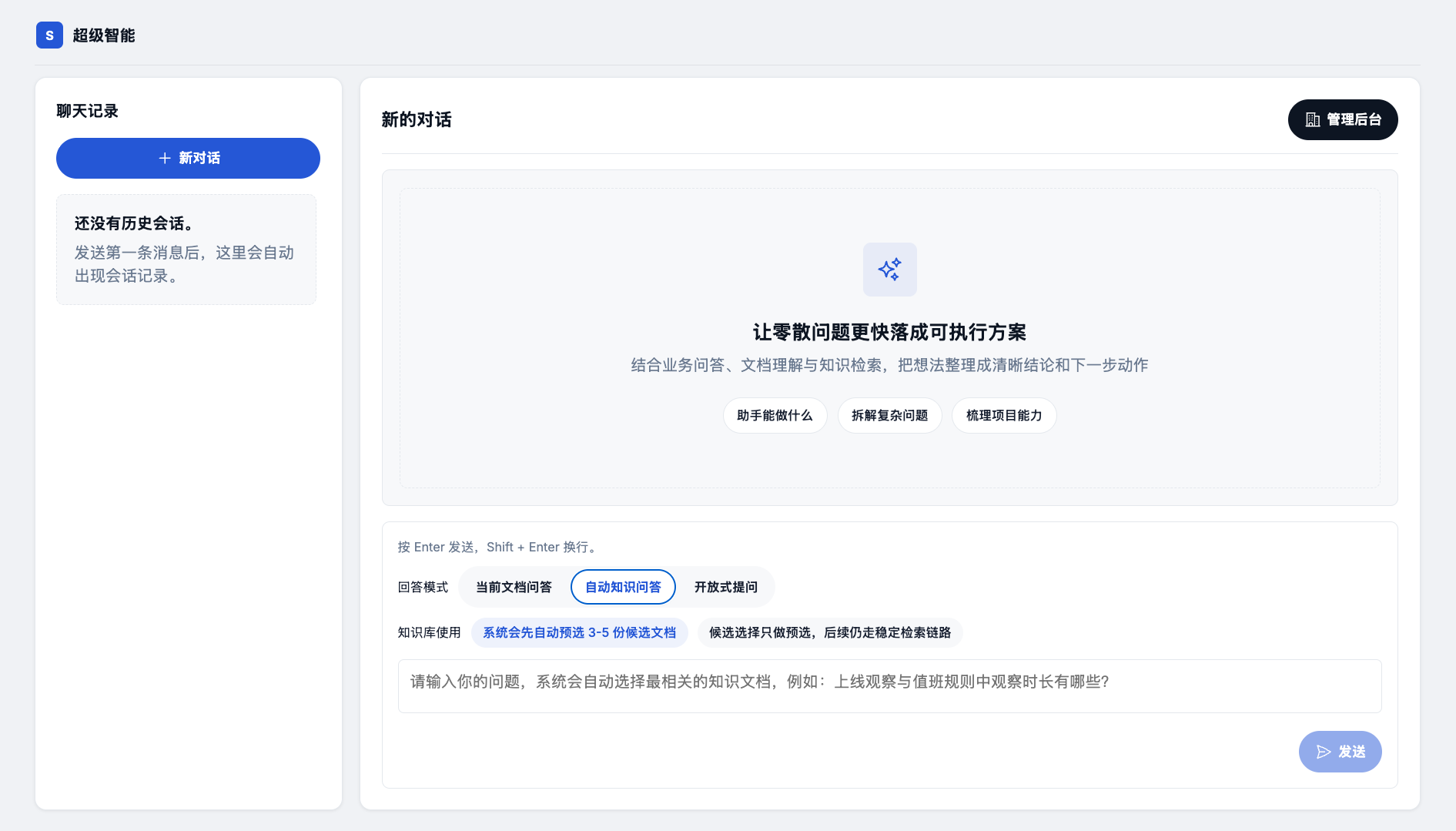 Super Agent 是一个 企业级 的 AI 智能体对话平台,覆盖了智能对话、文档知识问答、联网搜索、RAG 详细检索、MCP 工具协议、Skills 能力扩展、文档全生命周期管理等完整能力。