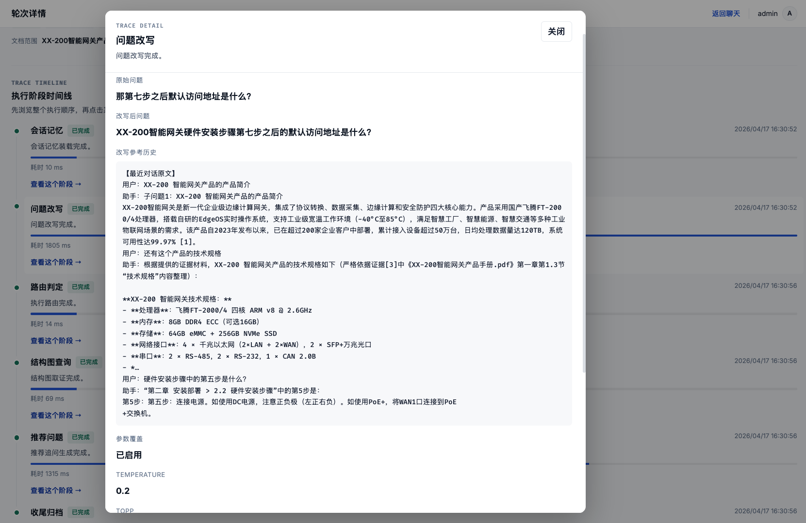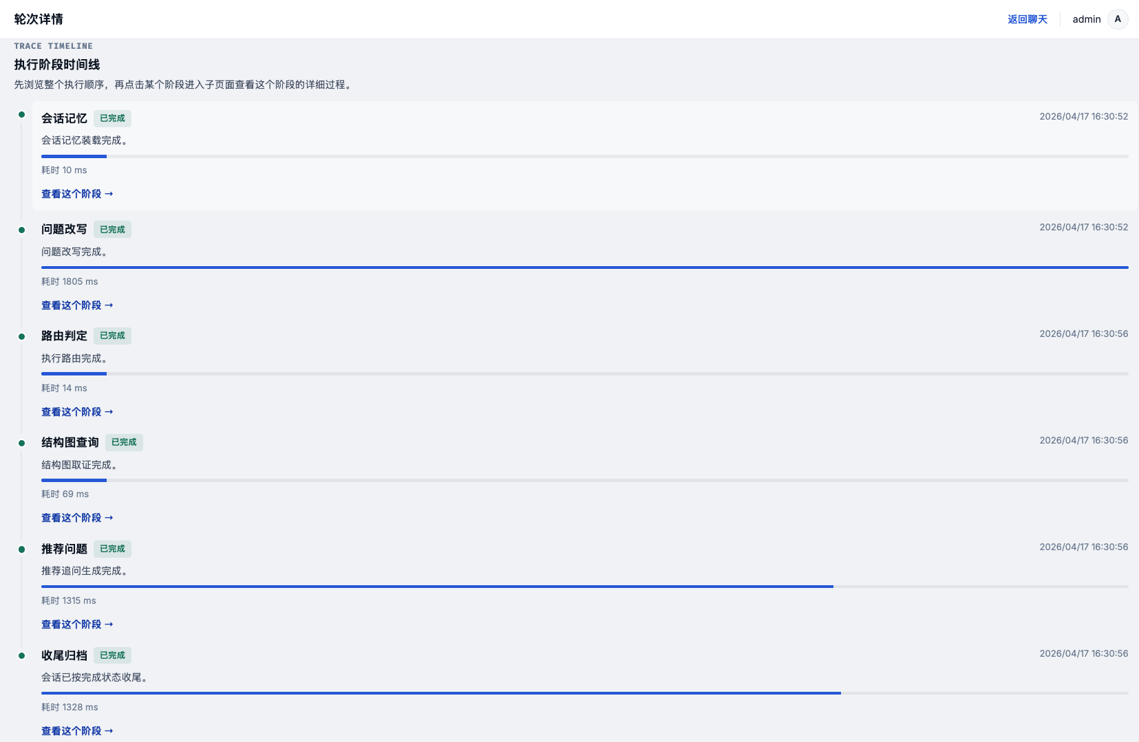 基于 AOP 的全链路追踪,每个环节的耗时、输入输出、决策结果都有记录。思考过程、检索通道使用情况、证据来源、工具调用记录——全部可视化呈现在管理后台的观测面板中。出了问题不用猜,直接看 Trace 就知道哪一步出了问题。