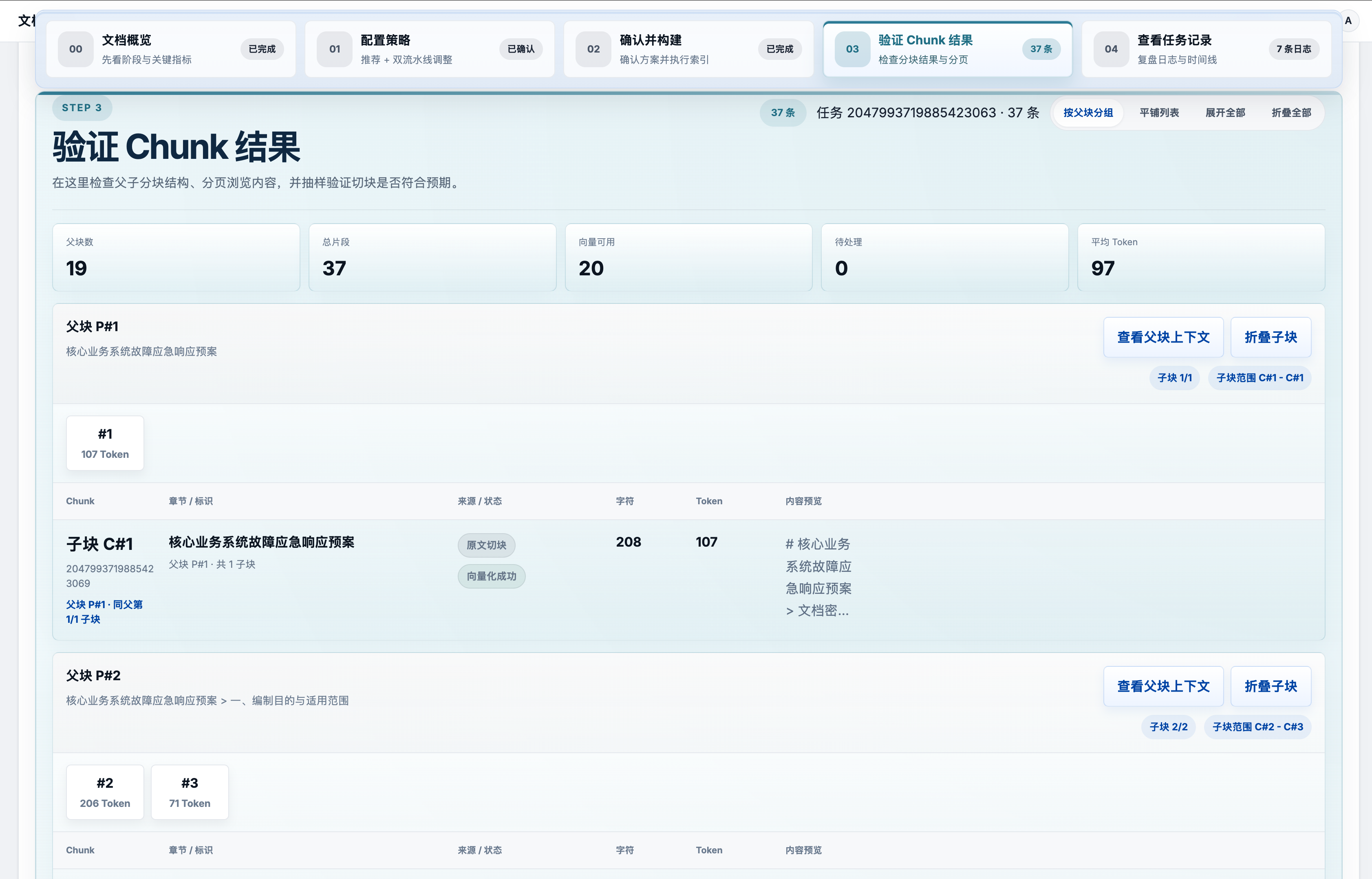 文档从上传到可检索的完整链路:Tika 多格式解析、四种切块策略组合流水线、向量化、向量数据库 + 倒排数据库 双引擎索引,每一步都有独立的任务日志和状态追踪
